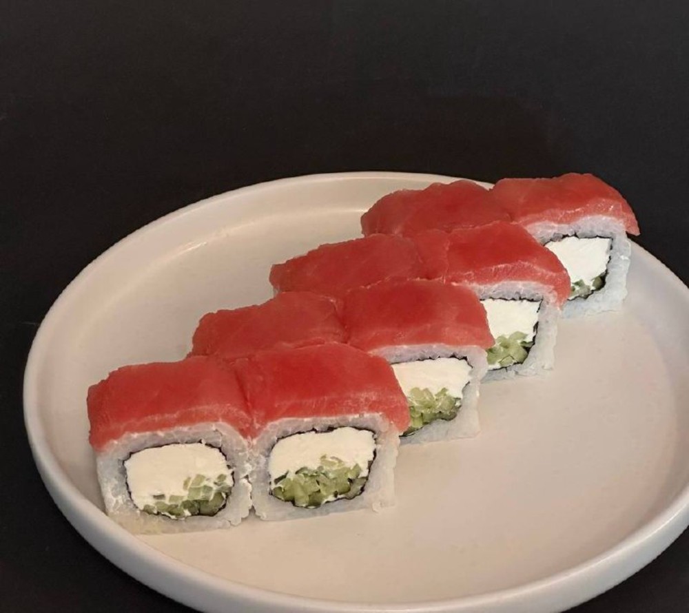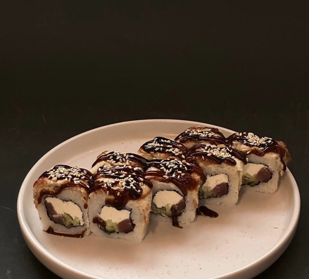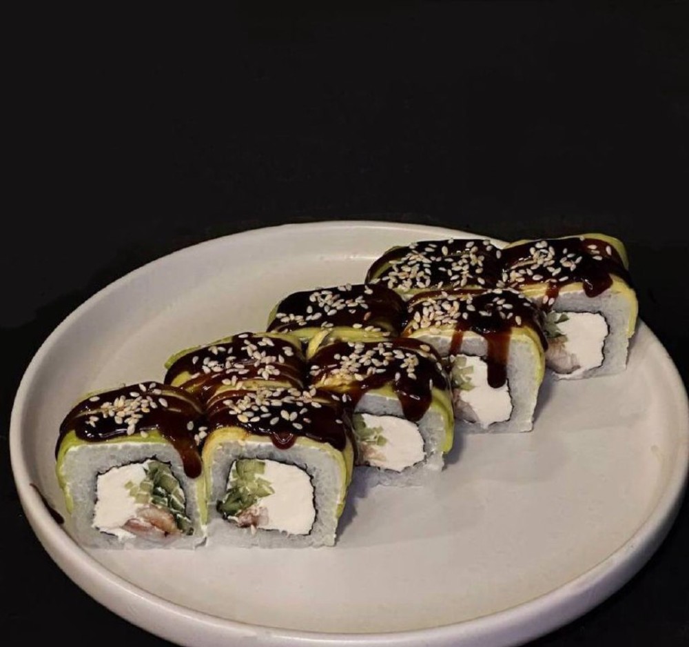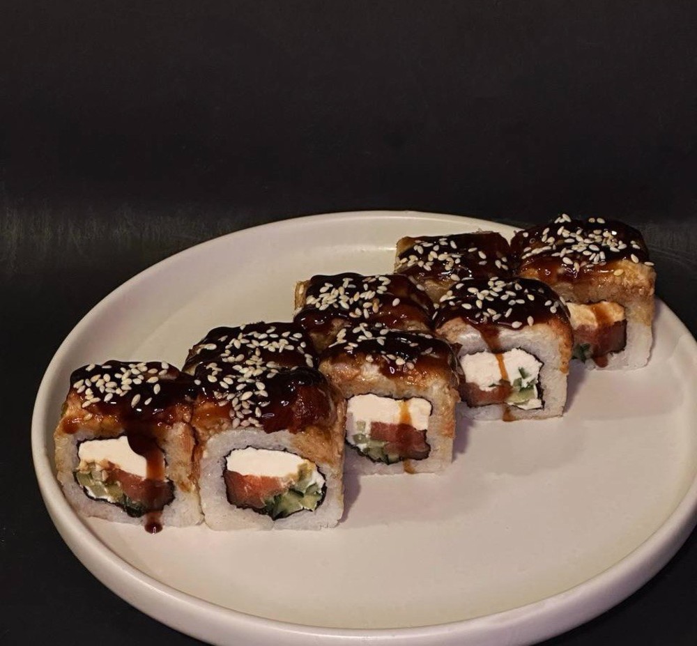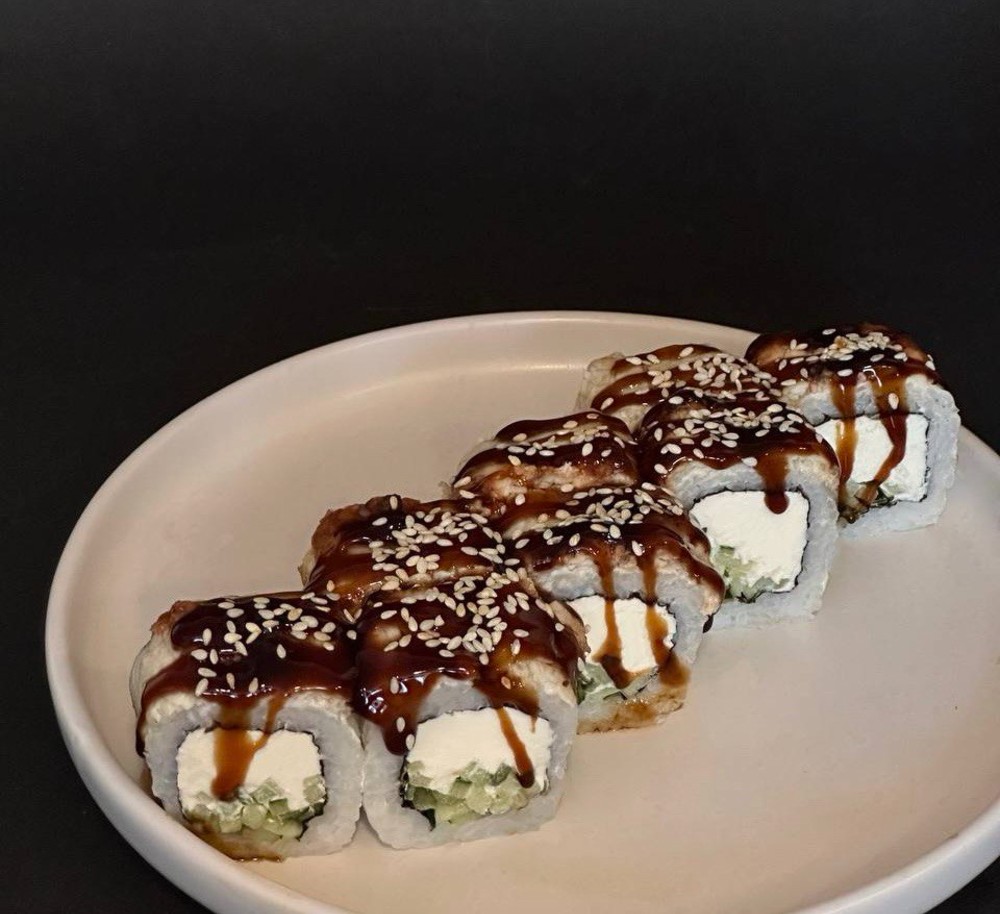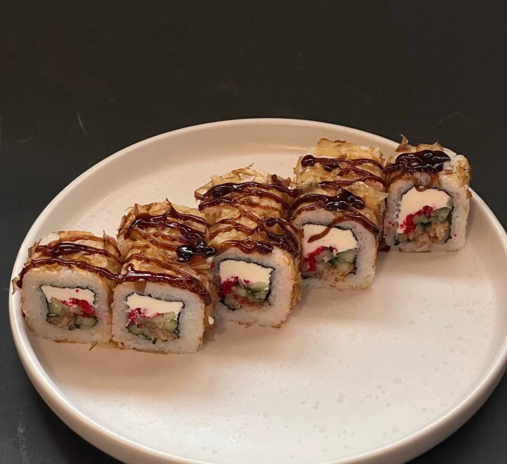 норі, рис, сир філадельфія, огірок, лосось, стружка тунця, соус унагі