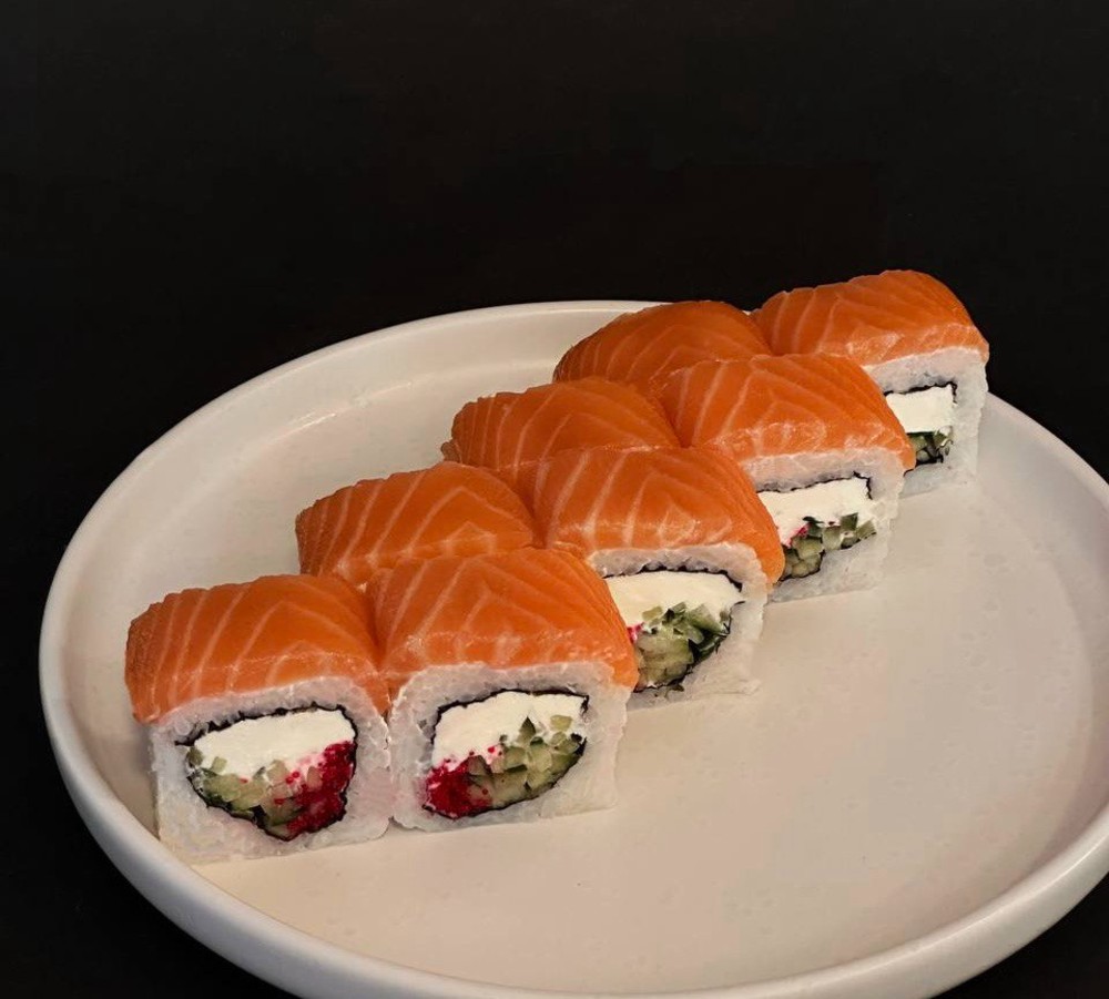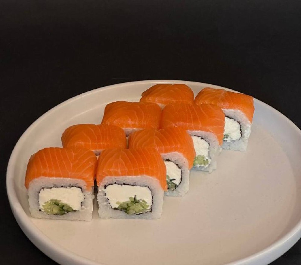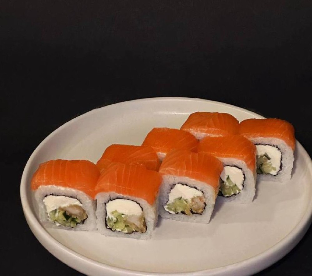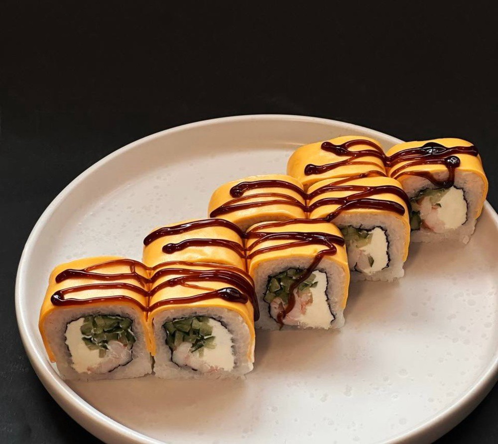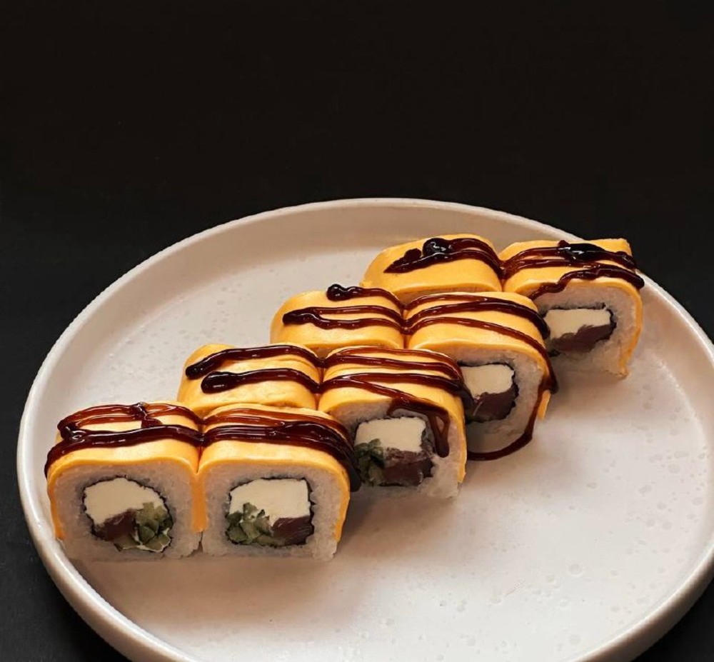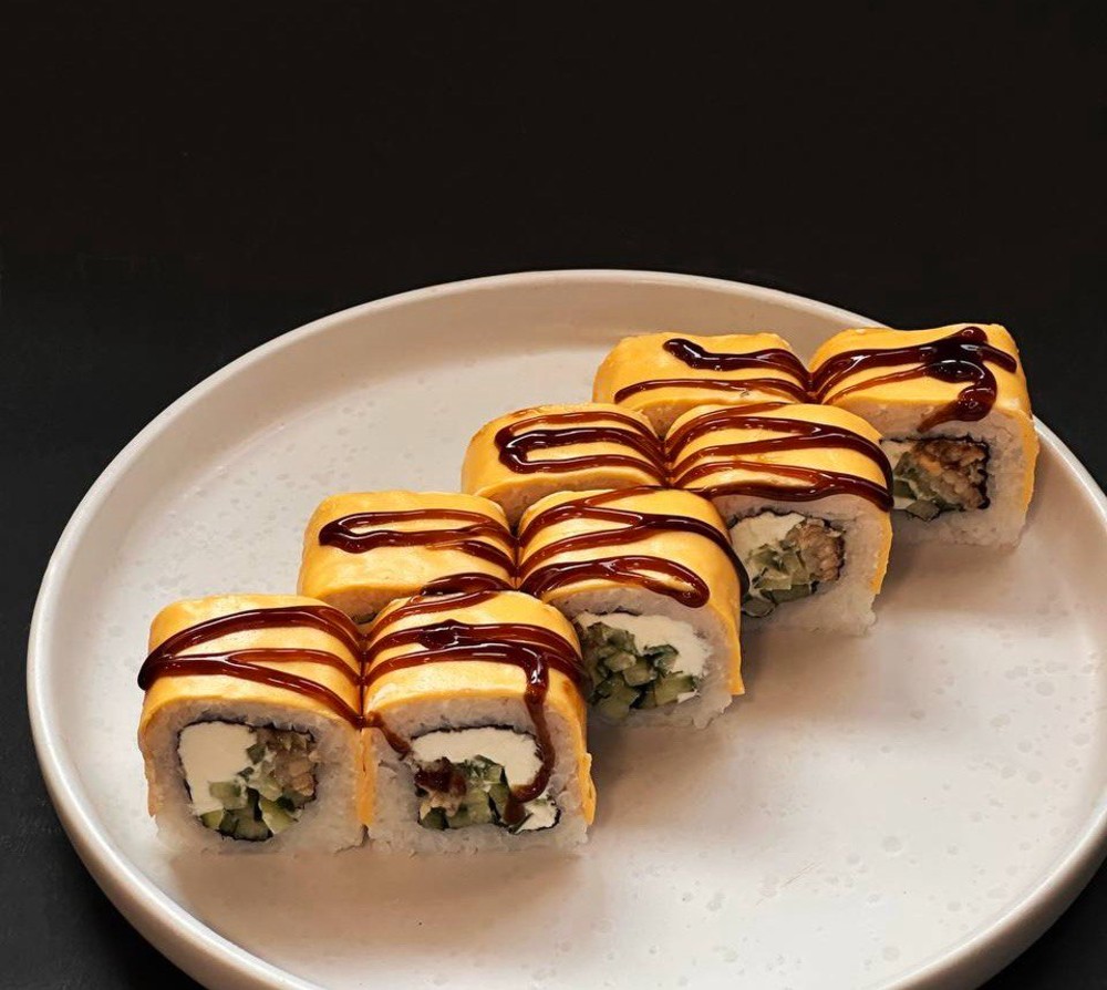 норі, рис, сир філадельфія, огірок, лосось, стружка тунця, соус унагі