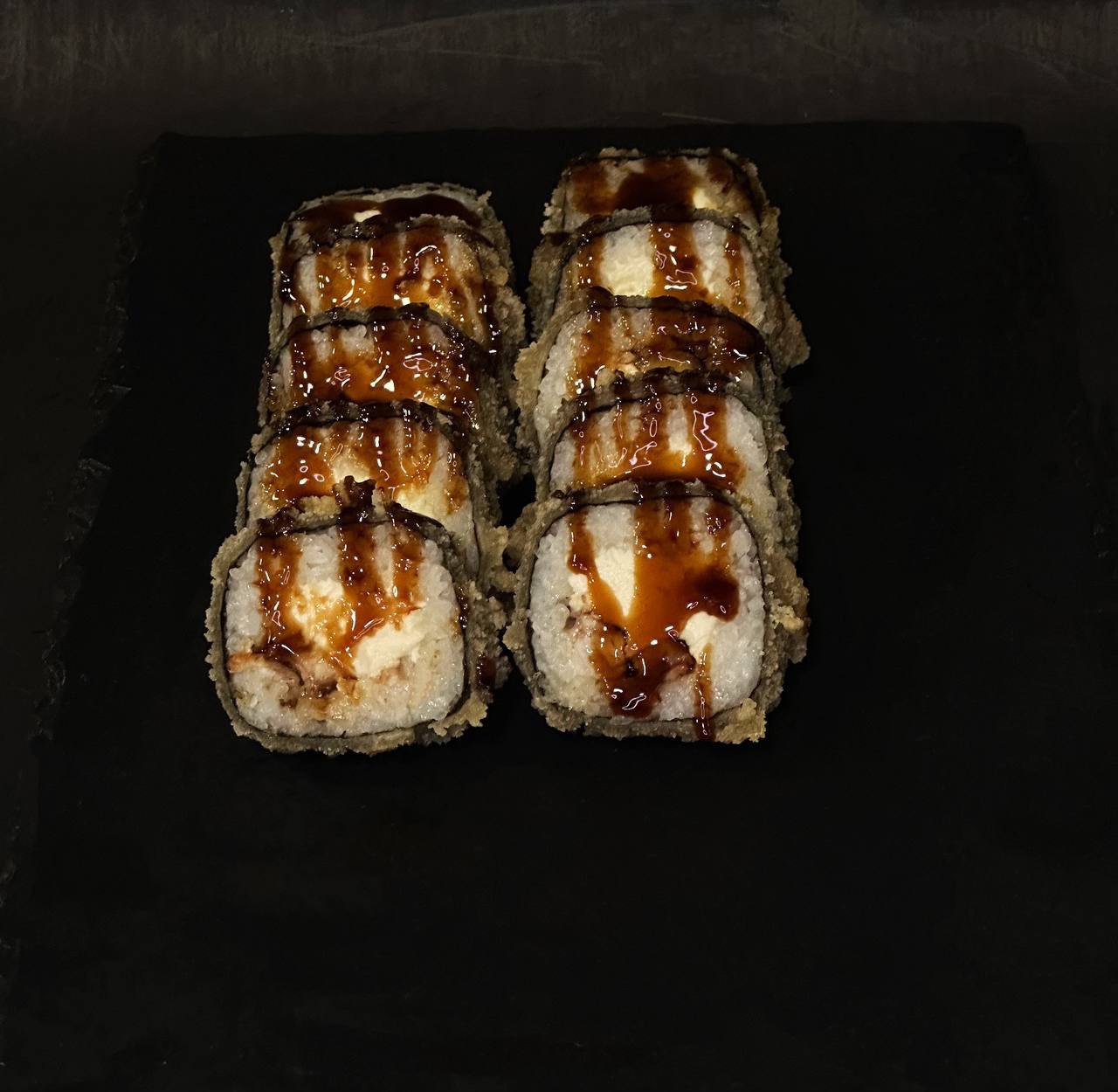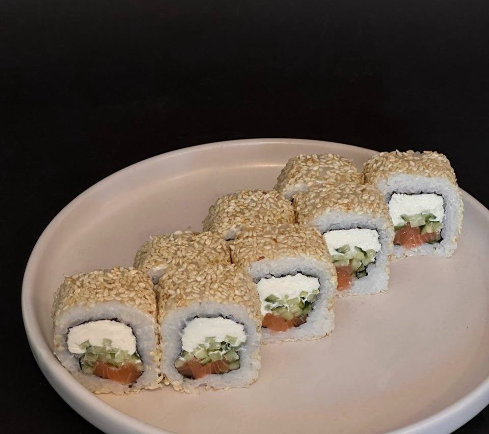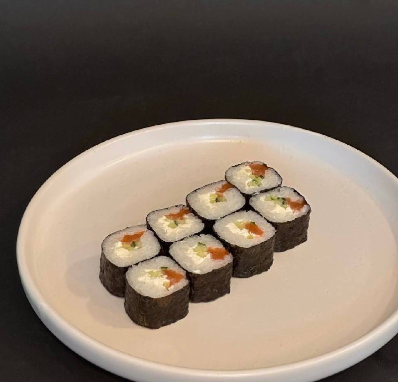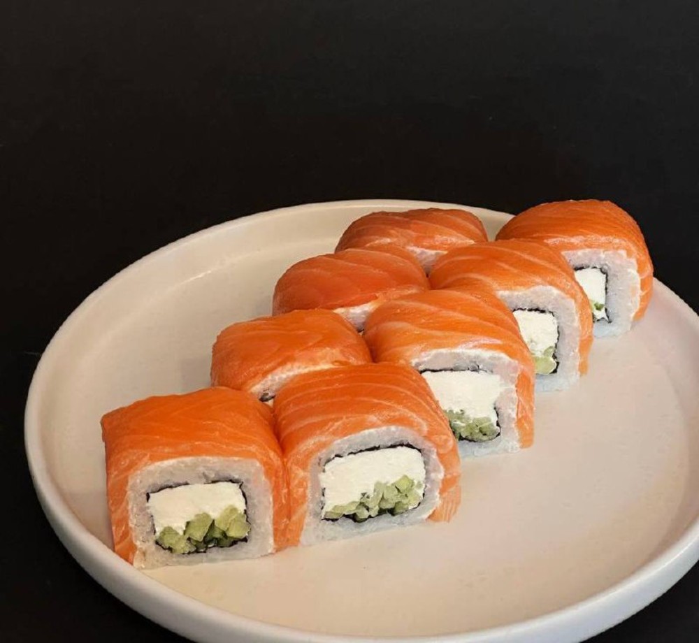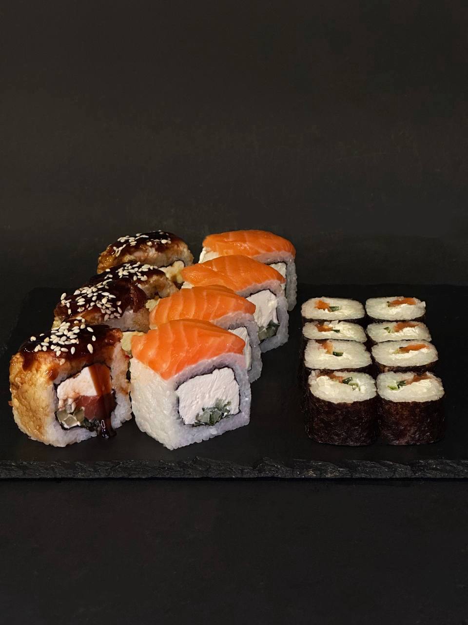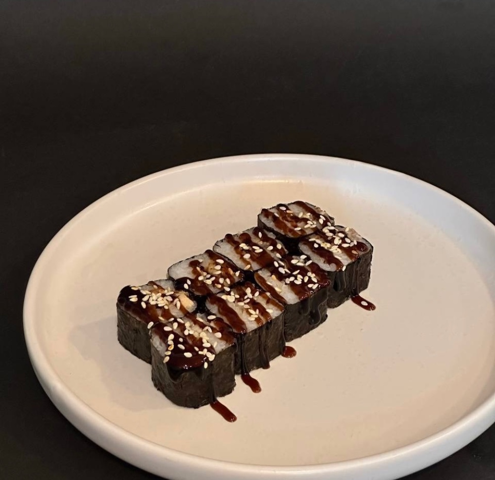 норі, рис, сир філадельфія, огірок, лосось, стружка тунця, соус унагі