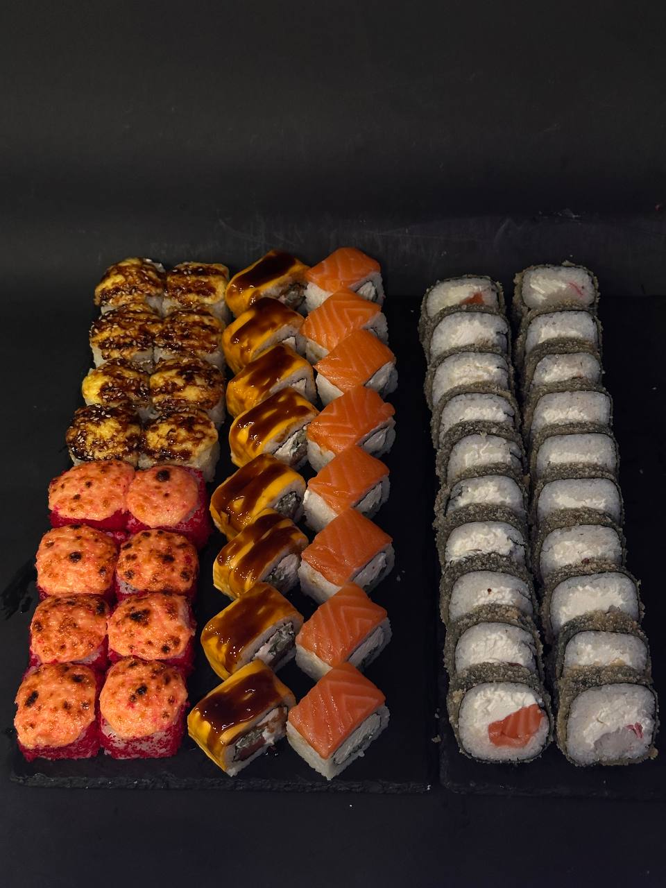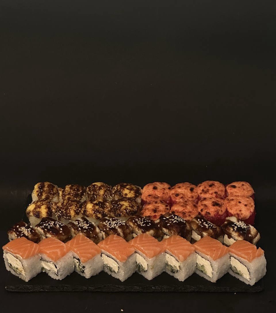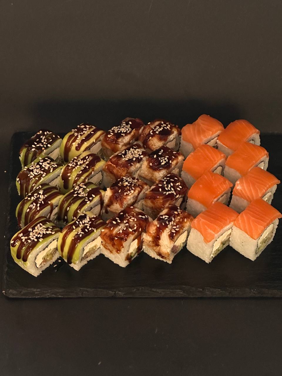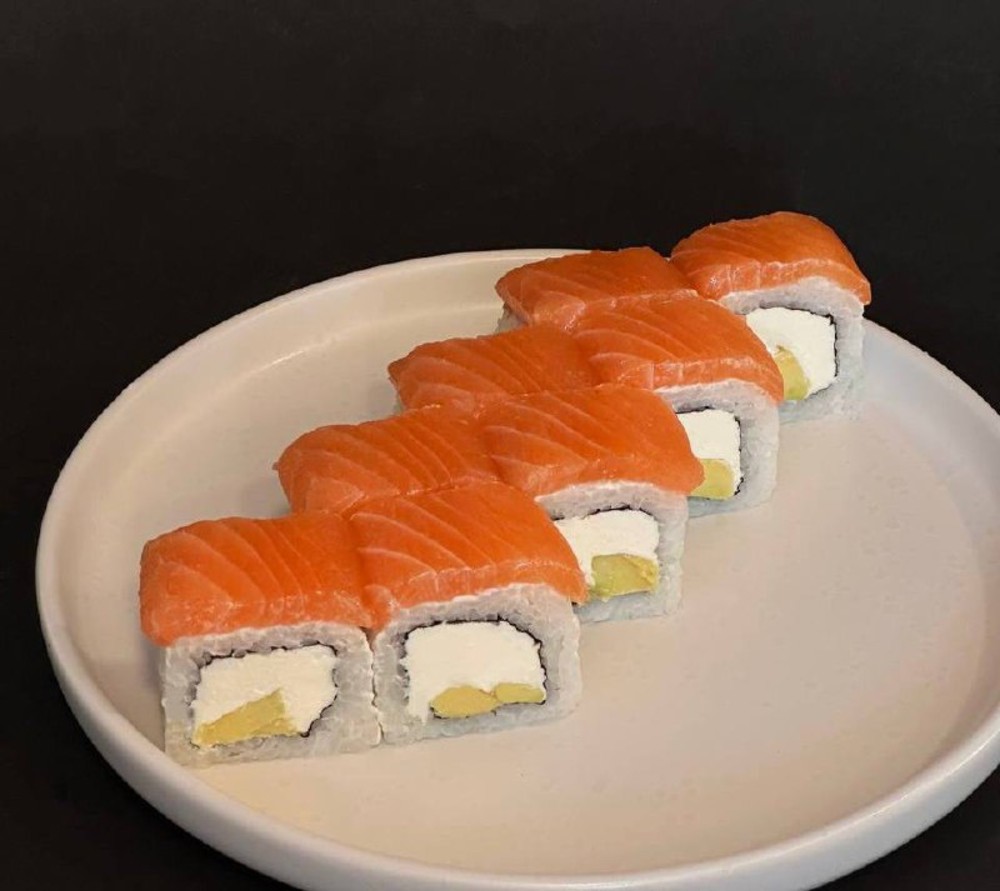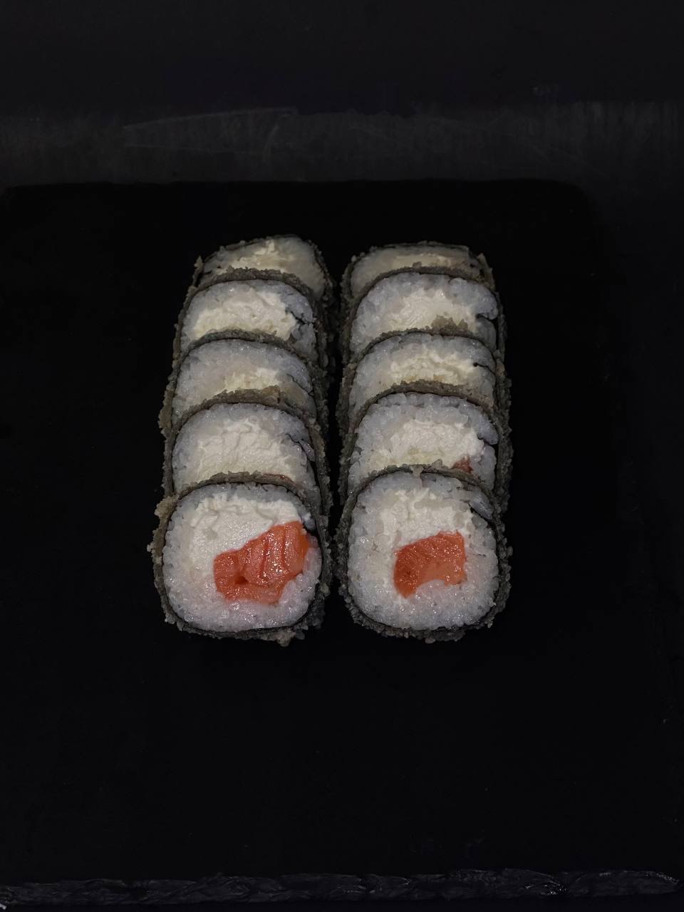 норі, рис, сир філадельфія, огірок, лосось, стружка тунця, соус унагі