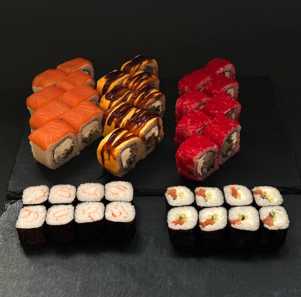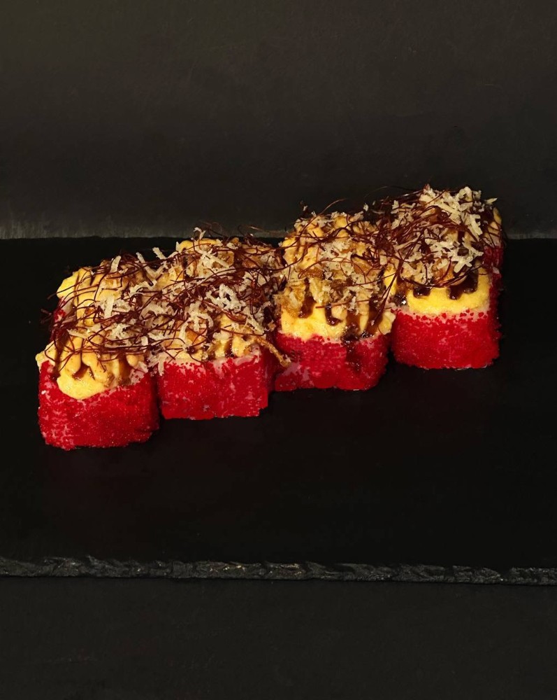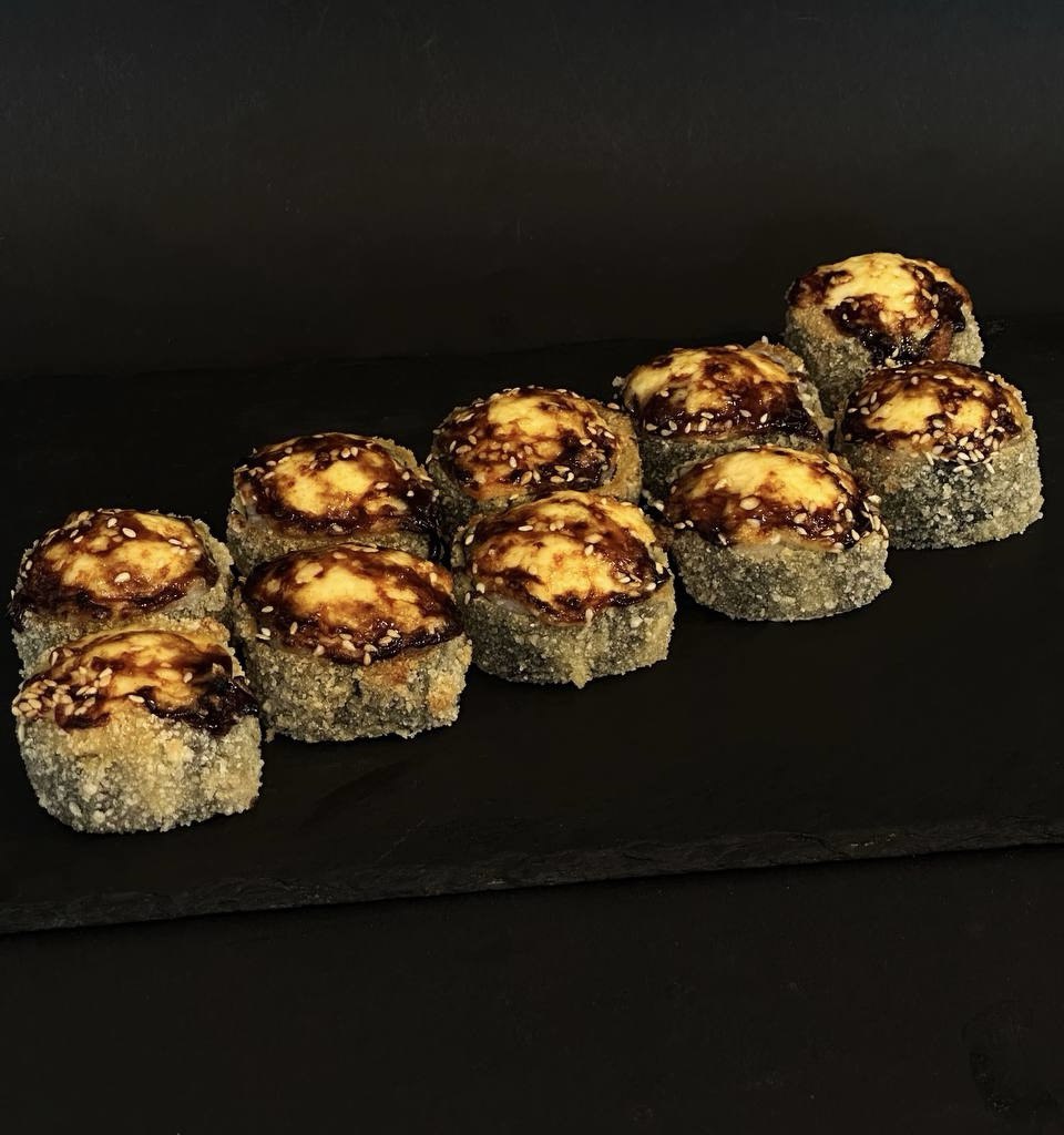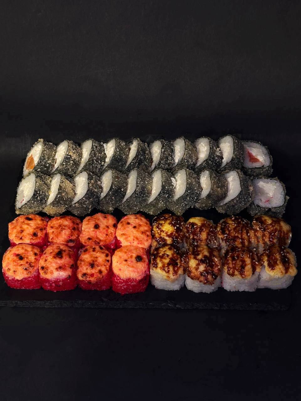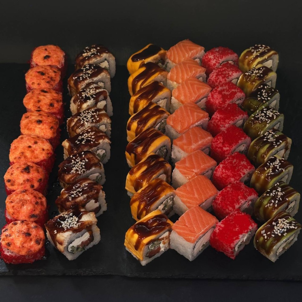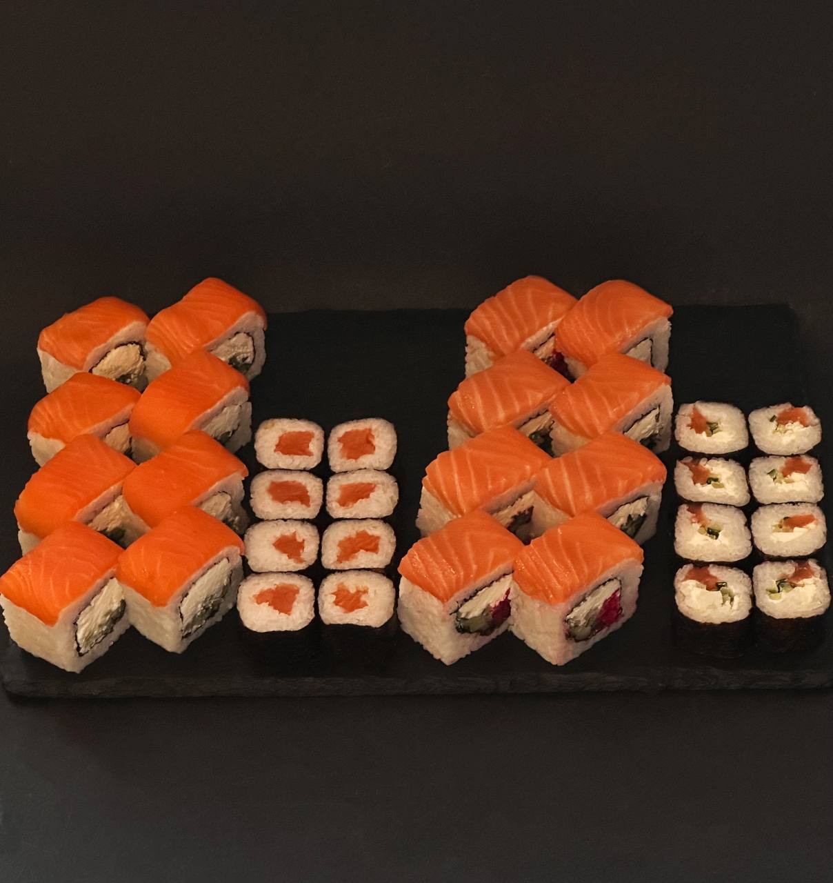 норі, рис, сир філадельфія, огірок, лосось, стружка тунця, соус унагі