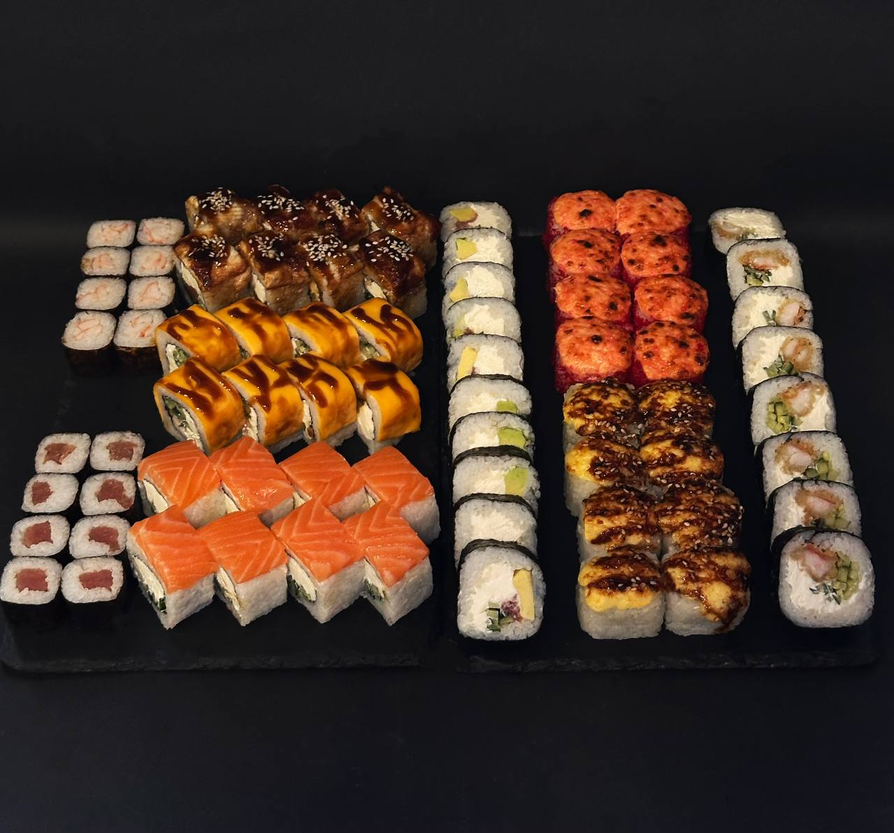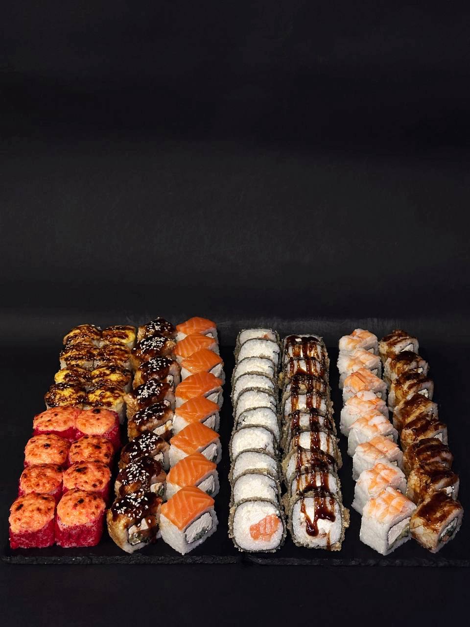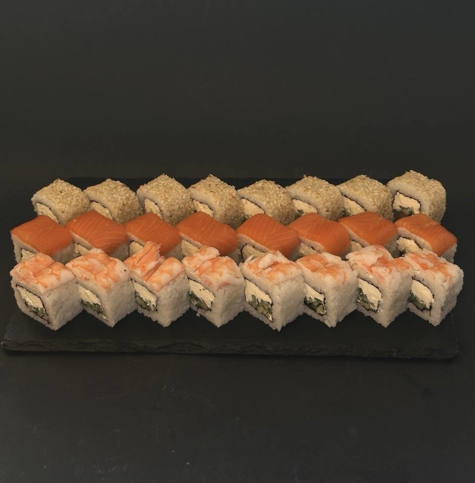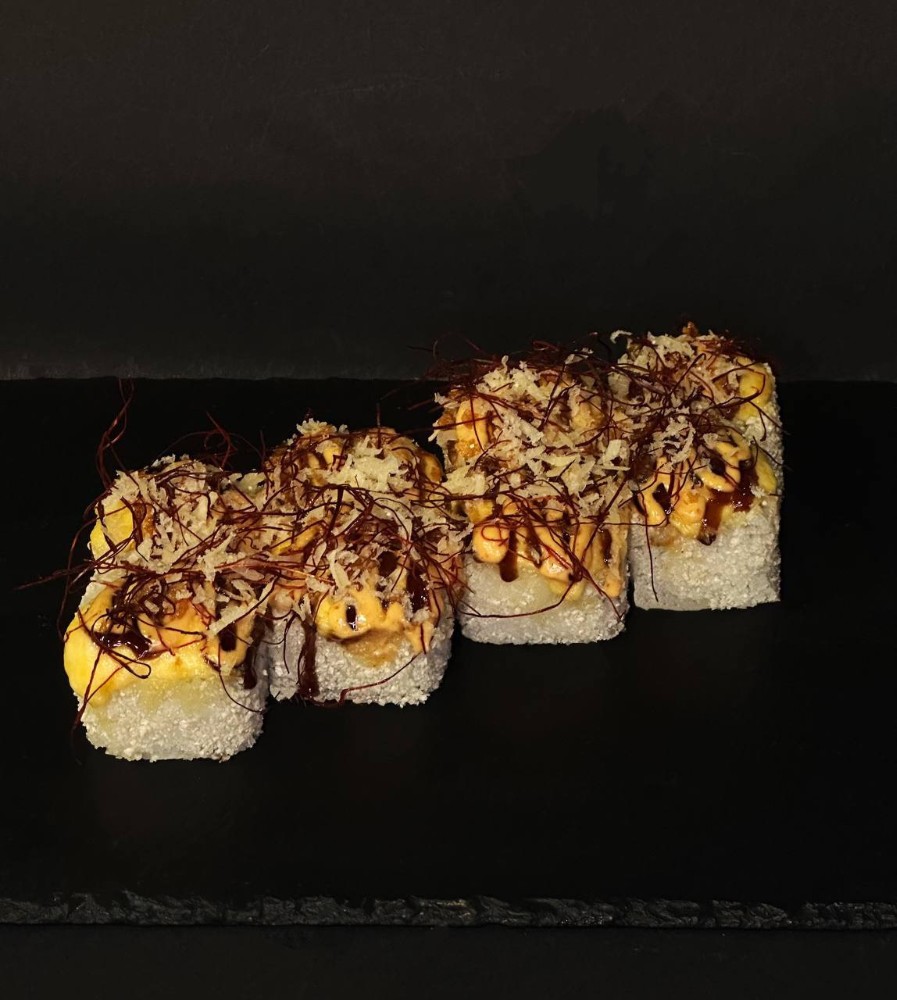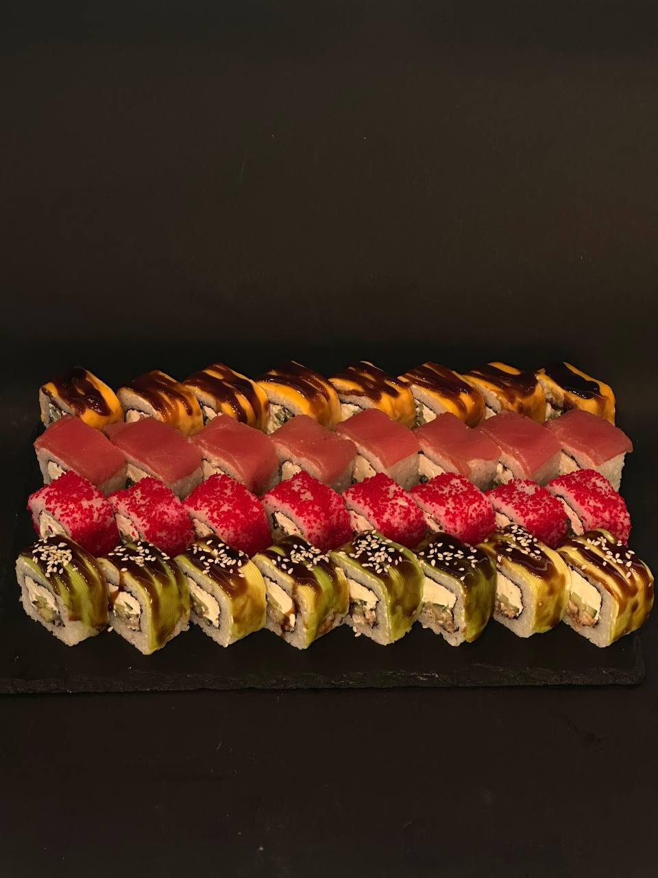 норі, рис, сир філадельфія, огірок, лосось, стружка тунця, соус унагі